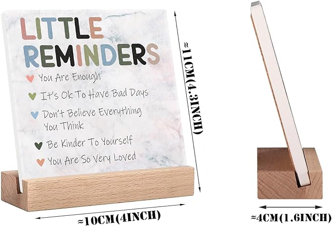 - 【Desk Signs For Office Decorations】 The inspirational quotes: " Little Reminders: You Are Enough, It's Ok To Have A Bad Days, Don’t Believe Everything You Think, Bekind To Yourself, You Are So Very Loved " . It not only expresses encouragement, but also conveys the feeling of artistic touch. It is easy to carry and takes up less space with a 4.3"x4.3" square ceramic plate and L4.3"x W1.5" wooden base.