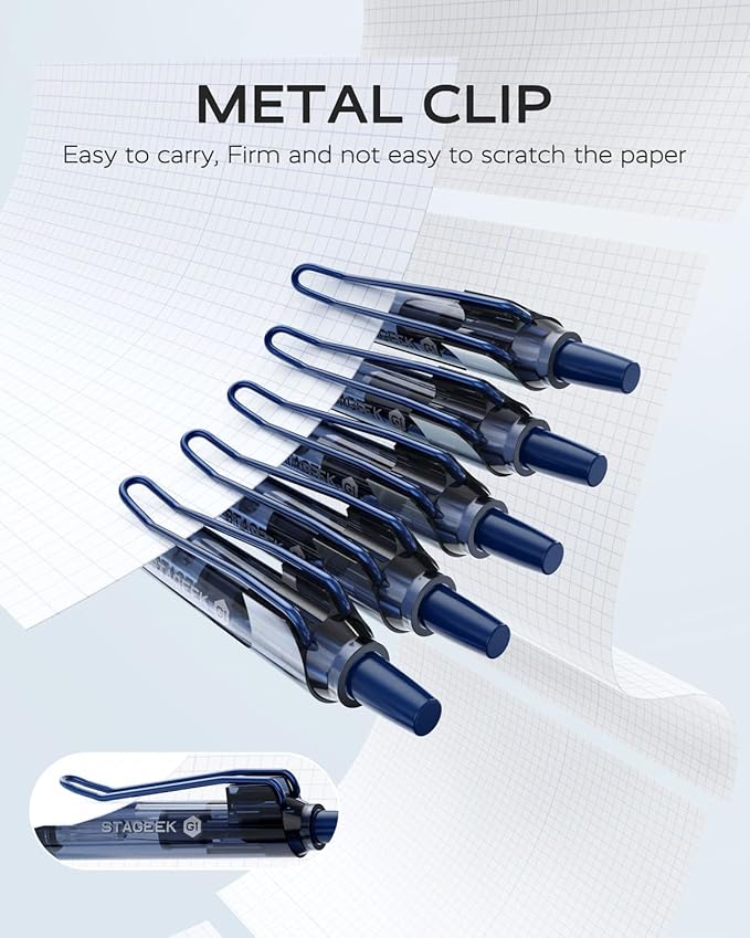 - [Metal Clip]: STAGEEK blue gel pens metal clip design, more stronger, more durable, and grips tighter. These blue gel pens can easy to securely attach to notebooks or pockets. The fine point pen designed for convenient carry, you’ll never lose these 0.5 gel pens