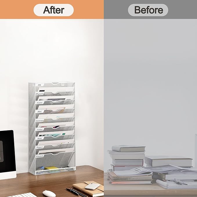 - Durable: The Mail organizer wall mounted is made of durable metal with a coating that extends the life of the wall mount. The metal mesh construction reduces weight while keeping air circulating through the wall paper organizer, so you don't have to worry about mold and mildew on your documents or papers