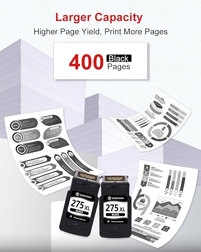- Longer-lasting Prints: EaseFusion 275 ink cartridges for canon printers offers an impressive high page yield of at least 400 pages per for canon 275xl black ink cartridge (based on 5% coverage of A4 paper). Get more printing without the need for frequent cartridge replacements