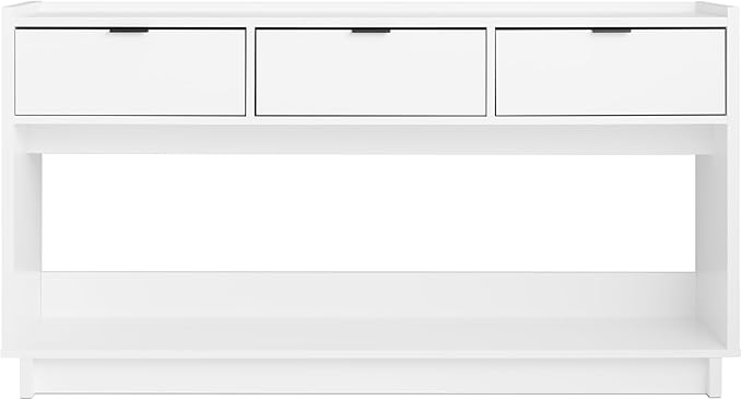 - DECLUTTER YOUR SPACE: This sleek white console table for entryway helps clear hallway clutter with 3 spacious drawers for media storage and an 18" shelf underneath that holds up to 20 lbs, perfect for extra storage in compact spaces. Dimensions: 15.25"D x 58.25"W.
