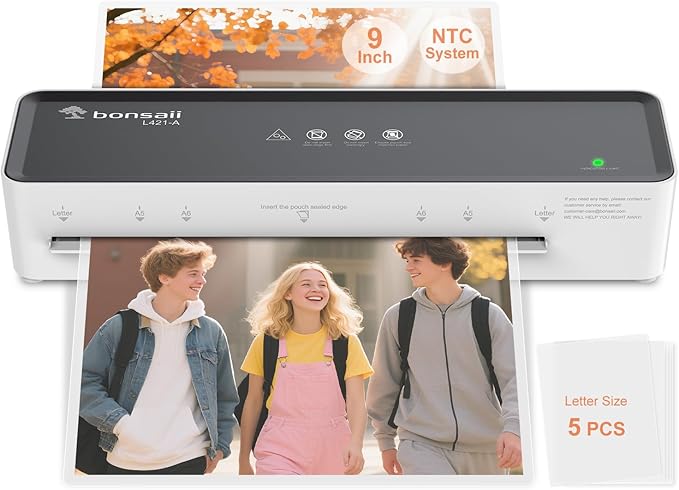- 【Versatile & Compact Design】The Bonsaii 9-inch laminator comes with 5 laminating pouches for instant use. Its compact design (12.65"L x 3.74"W) ensures easy storage and portability, making it ideal for home, classroom, or office lamination tasks.