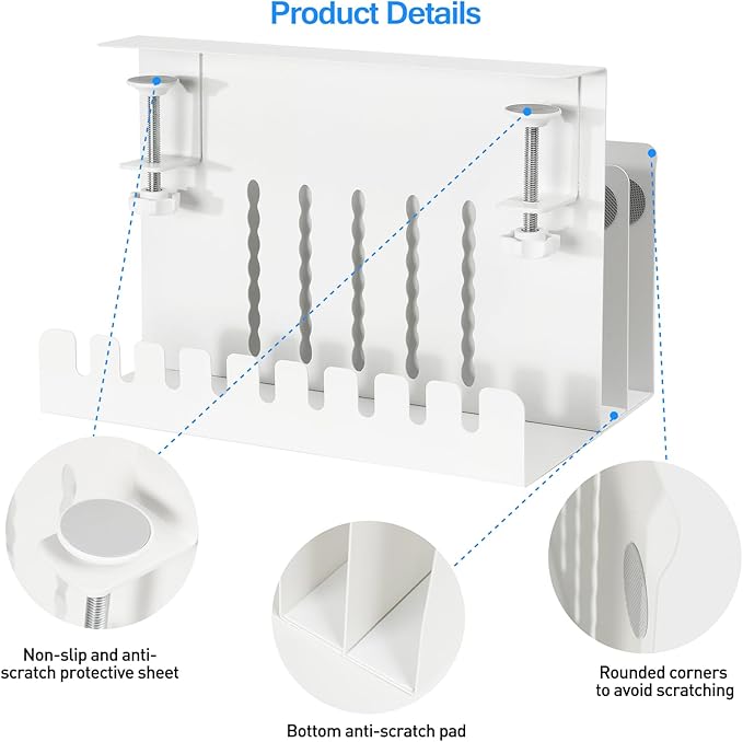 - 【Clamp Under Desk Storage & No Drill Design】Our clamp on side desk storage requires no drilling or tools. The rubber cushion prevents scratches on desks and other objects, and the rounded corners design also helps avoid scratches.