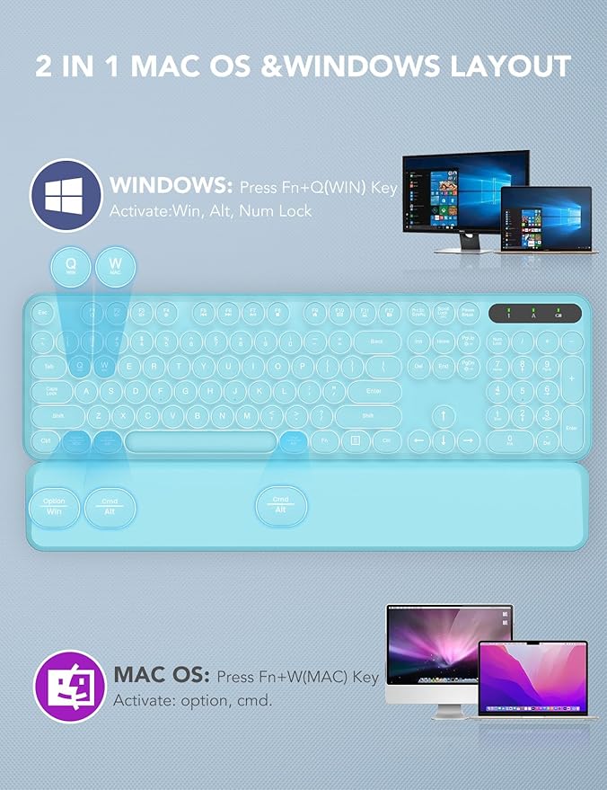 Wireless Keyboard and Mouse Backlit - Typewriter Keyboard with Retro Round Keycaps, Detachable Wrist Rest, Light Up Letters, 2.4G Rechargeable Combo for Mac, Windows, PC, Laptop, Trueque (Aqua Blue)