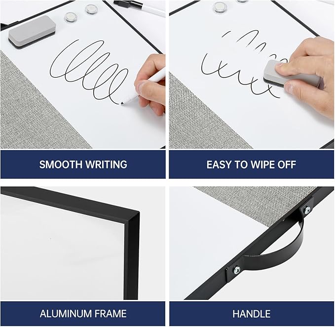 - PREMIUM QUALITY: This 12" X 16" small whiteboard set includes dry erase board and linen board. The magnetic whiteboard comes with a smooth surface, easy to clean up and write on. The bulletin cork board is equipped with premium linen, fits all variety of nails and pins without damage to the cork.