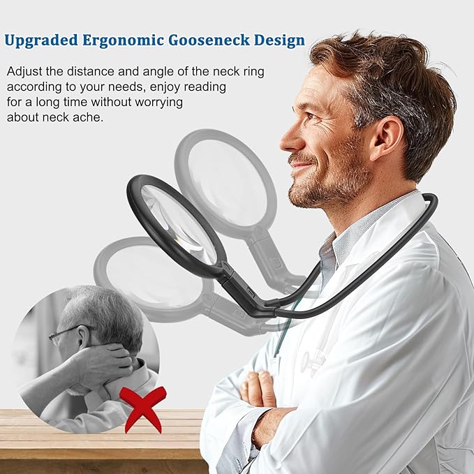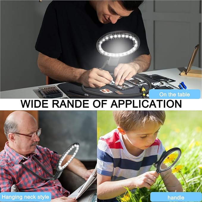 - 3-in-1 Magnifying Glass: The rechargeable magnifier with light can be worn around the neck, or it can be firmly placed on a table or used as a handheld magnifying glass; this lighted magnifier can meet your needs for close-up work such as reading, sewing, crafts, checking jewelry and coins in daily life and work