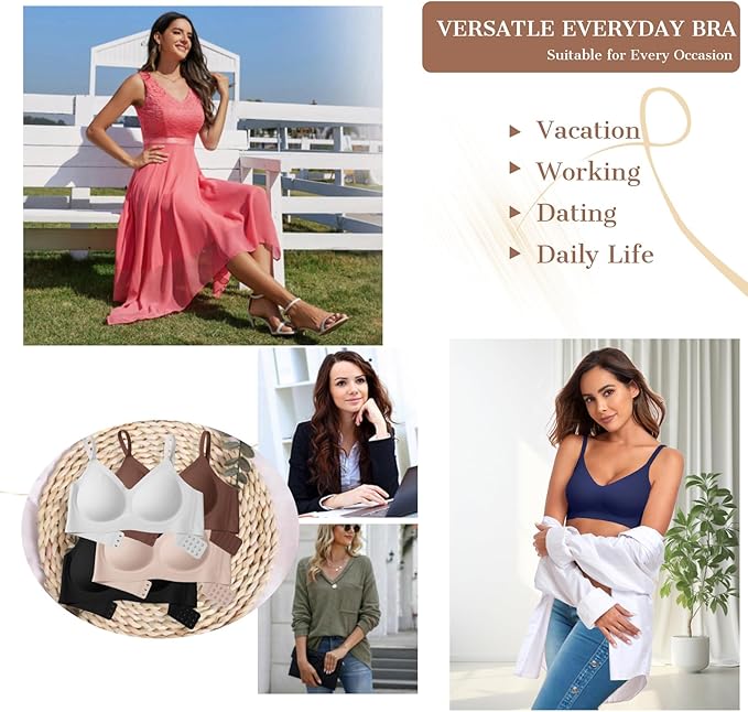 - Adjustable 4 row hooks V neck bralette - The V neck bralettes for women feature 4 rows of adjustable hooks, with 3 hooks on each row, providing additional support and concealing back fat, making it easy to find your perfect fit. The V neck design of this bralette gives you a sexy cleavage look. It is an ideal t-shirt outfit bra for women.