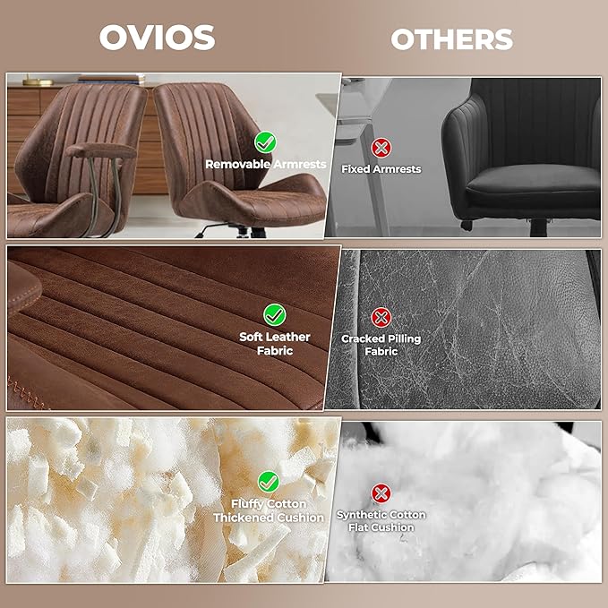 ovios Ergonomic Home Office Chair, Mid-Century Modern Faux Leather Chairs with Padded Armrests, Comfy Mid Back Swivel Rolling Executive Computer Armchair (Dark Brown, Suede Leather)