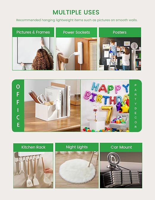 - Washable & Reusable: The double sided tape is washable and reusable. It leaves no sticky residue when removed, allowing you to say goodbye to nails, screws, and standard strips that can damage wall surfaces