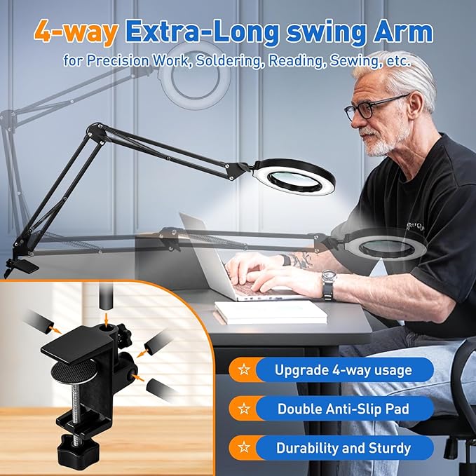 - New Upgraded Flexible Extra Long Metal Arm: This 12X lighted magnifying glass with stand has an upgraded 2*13.2 Inches extra long metal flexible swing arm, extending up to 42.5 inches with 2 knobs and 4 springs for maximum reach and flexibility. The newly upgraded lamp head locking system can prevent the lamp head from falling off for improved durability, stability and performance
