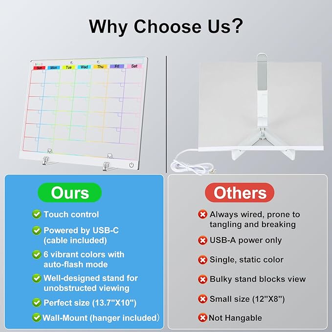 Acrylic Dry Erase Board Calendar with Light, 13.7"X10" LED Note Board with 6-Color Neon Glow Memo Monthly Planning Board for Gift/Room/Office/Wall with Stand, 7 Markers, White