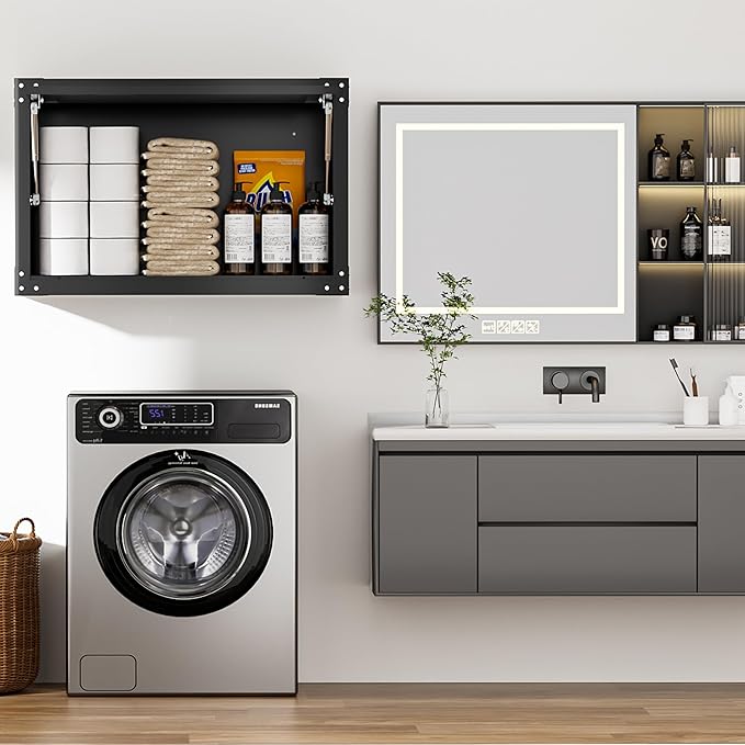- 【Saving Floor Space】The INTERGREAT wall mounted cabinet can meet your storage needs without taking up floor space. The dividers of the wall mounted cabinet can be adjusted according to your needs to hold different sizes of items. The hydraulic spring top door design makes it easy to open the door to access items.