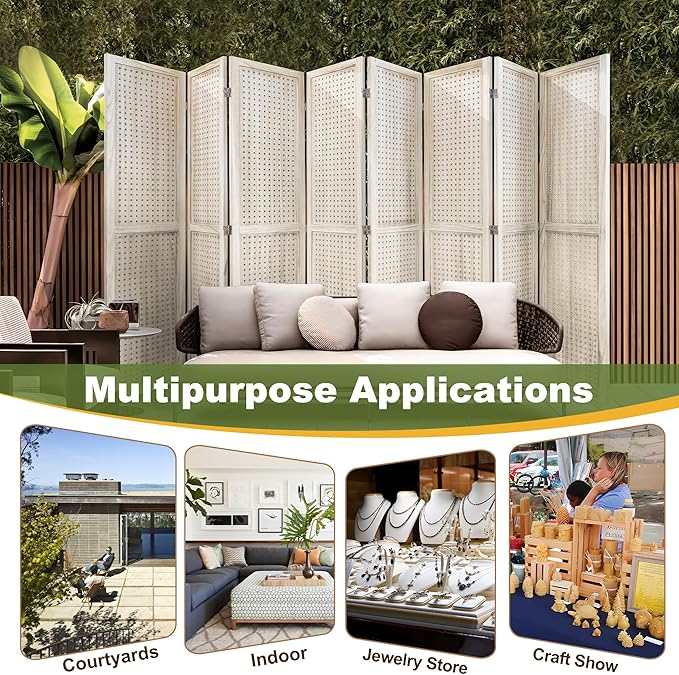 - Versatile Pegboard Panel Design:Our pegboard panel features 0.3-inch diameter holes spaced 1 inch apart, compatible with various peg hooks. This room divider doubles as a decorative folding privacy screen or wall organizer, and serves as a freestanding display panel for trade shows, craft fairs, department stores, and more.