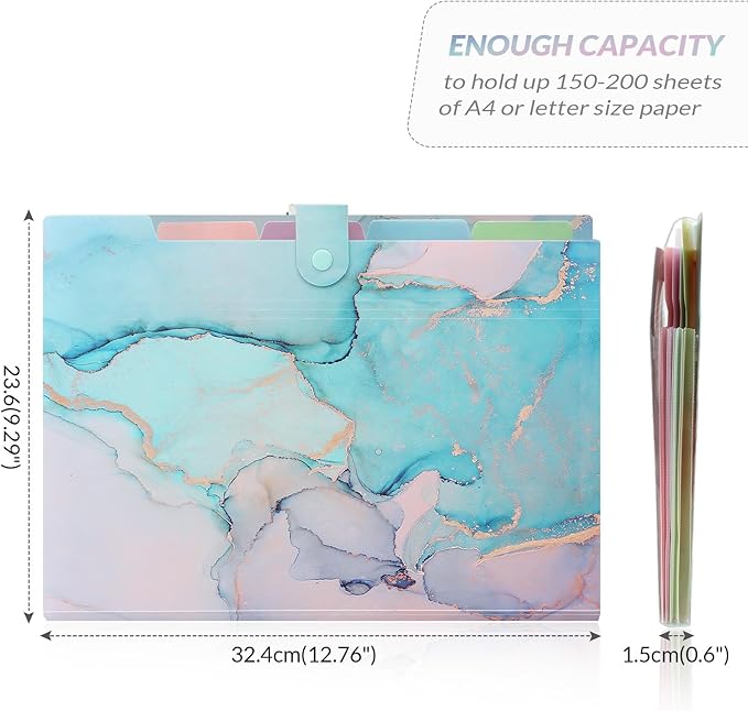 - Folder Size: 12.8'' x 9.5'' x 0.7''. This size makes it ideal for standard, letter-sized sheets of paper. Fix maximum 150-200 pages. Sturdy and Portable.