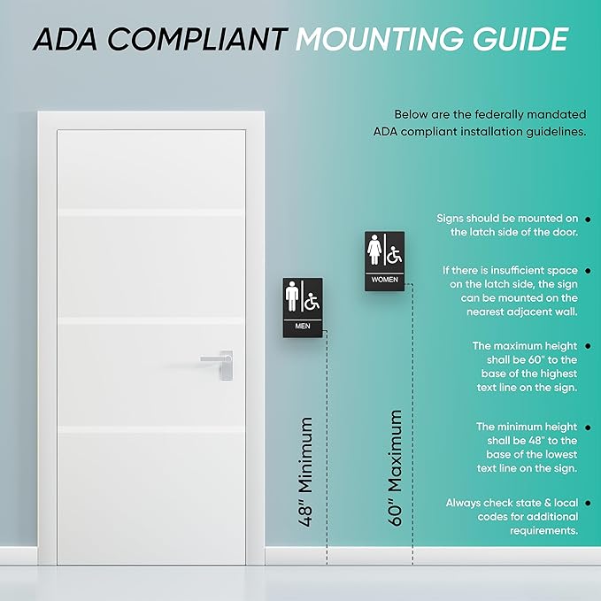 - š» UNIVERSALLY UNDERSTOOD & ADA COMPLIANT: The bathroom door sign is understood by all people, both ladies, gents, boys and girls as to which way the toilets are located. The sign is also ADA standard and can be used by those who are handicapped or in a wheelchair and ensure that your business stays compliant.