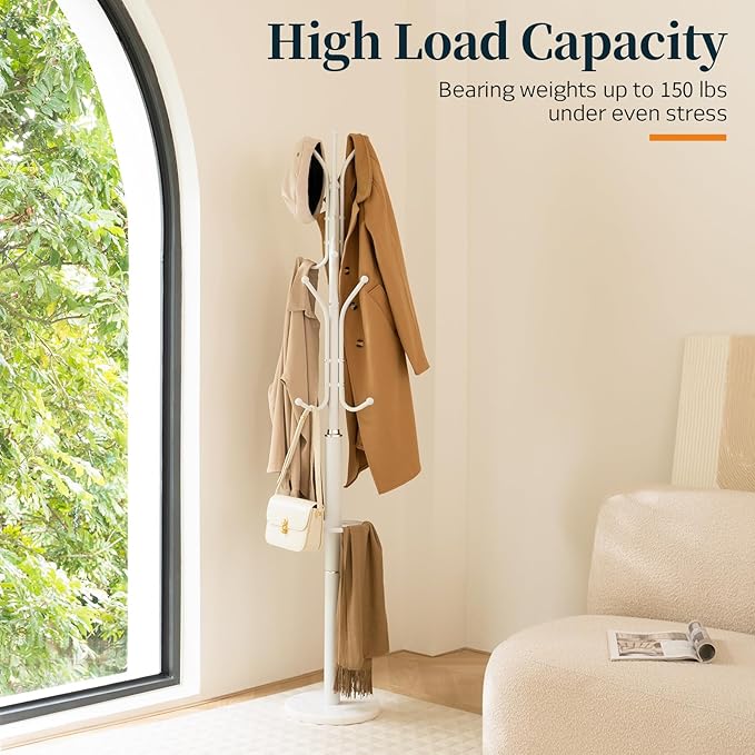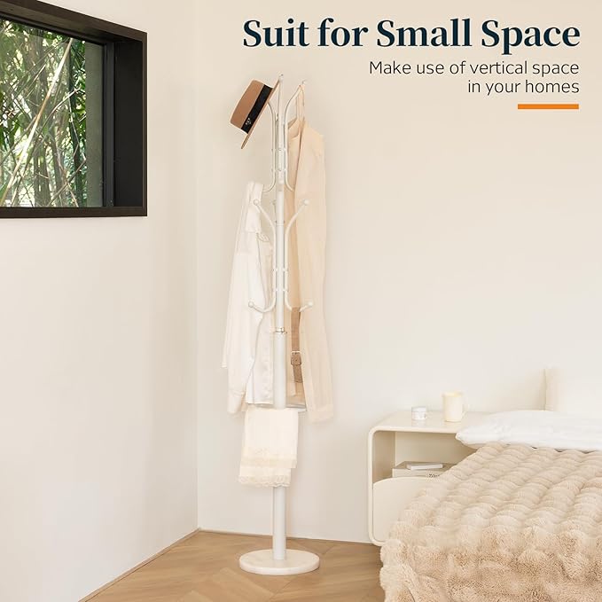 - 【Space-saving & Versatile】The modern coat rack takes up little space but maximizes your vertical area, perfect for small spaces. More than just a standing coat rack tree, it doubles as an entryway coat rack, jacket hanger stand, hat tree, bag rack, etc. The white coat rack fits seamlessly into your entryway, porch, cloakroom, bedroom, office, or any corner.