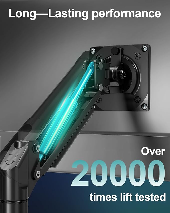 - Strong Support: The computer stand is designed with aluminum arm and a strong gas spring that has undergone 20,000 motion tests to ensure long-lasting performance and provides excellent stability to support monitors from 4.4 to 22 lbs. You can extend the monitor arm out 19.7″to bring your screen closer or raise it up to 17.3″above the desk surface for a better viewing position. This dynamic adjustment makes it possible to position your screen closer to eye level for more comfort.