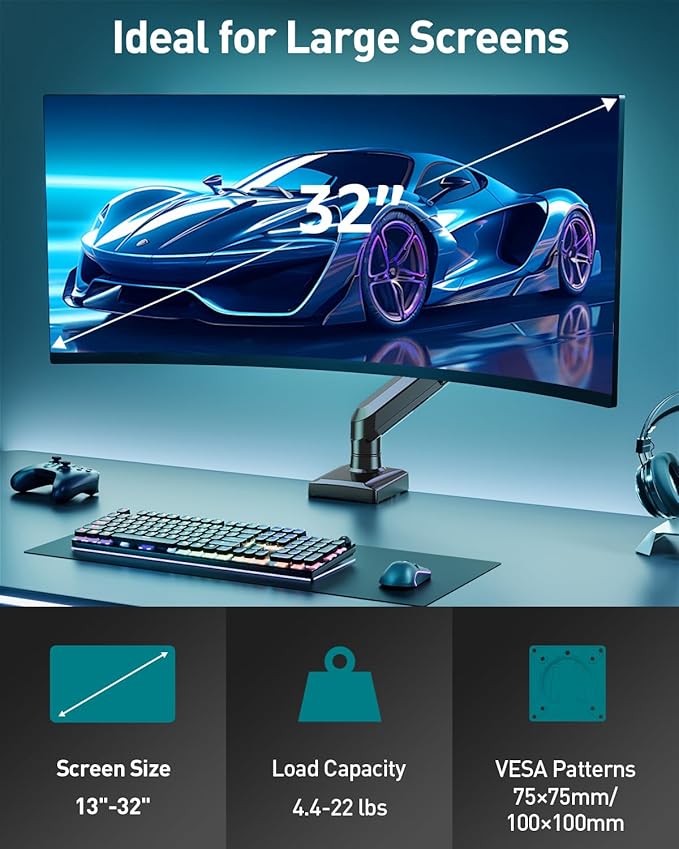 - Universal Monitor Mount: Our single monitor arm perfectly fits most flat or curved LCD/LED screens ranging from 13" to 32", with a max load capacity of 22 lbs, suitable for VESA patterns of 75x75mm & 100x100mm. Compatible with ASUS, Acer, Samsung, LG, AOC, Dell, etc., not limited to 32 30 28 27 25 24 23 22 21 20 19 17 inch screen, but not compatible with 1000R/1500R/1800R curved screens.