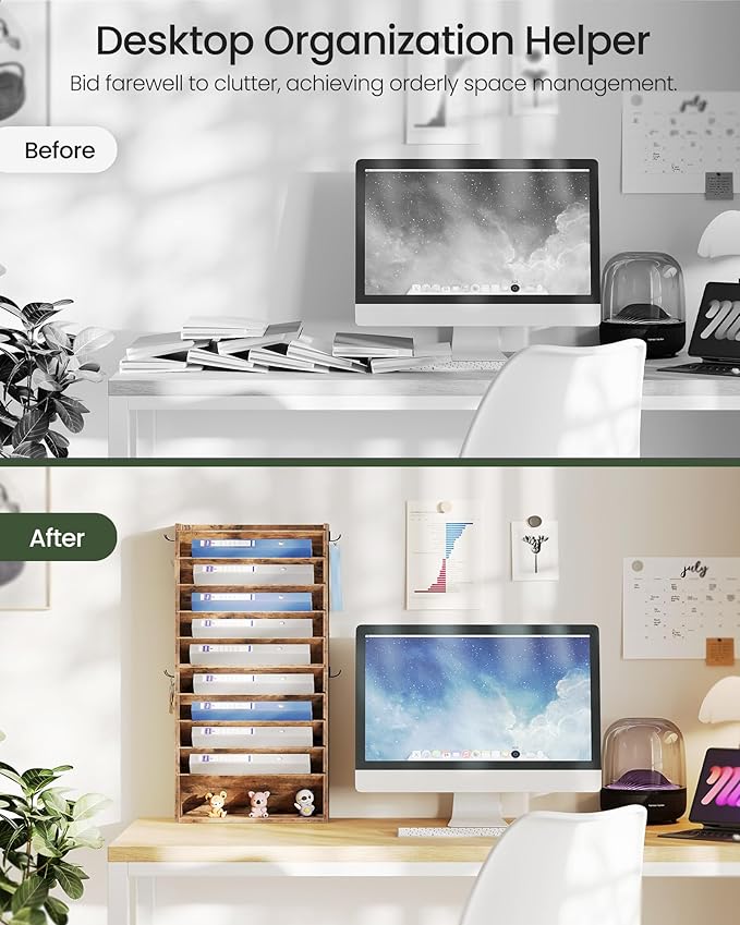 - Crafted with a 13.2"L x 5.5"W x 31.5"H 10 tier vertical design, this file sorter can either sit gracefully on your desk or be effortlessly mounted on the wall with its back holes, maximizing your area while enhancing your organizational ease