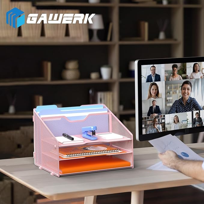 Letter Tray Organizer, Mesh Desk File Organizer with 3 Paper Trays and 2 Vertical Upright Section (Pink)