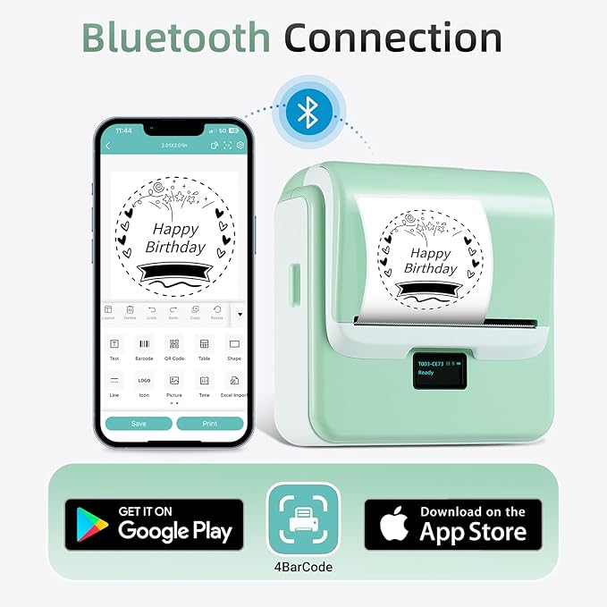 - Powerful App: With Bluetooth connectivity, you can use the free 4Barcode app, which offers over 150 ready-to-use label templates to boost your efficiency; You can also design and save your own templates with access to 80+ fonts and 670+ icons; The app supports a variety of features, including QR codes, barcode labels, tables, materials, timestamps, numbers, text, icons, and more, enabling fully customized label creation
