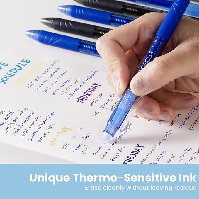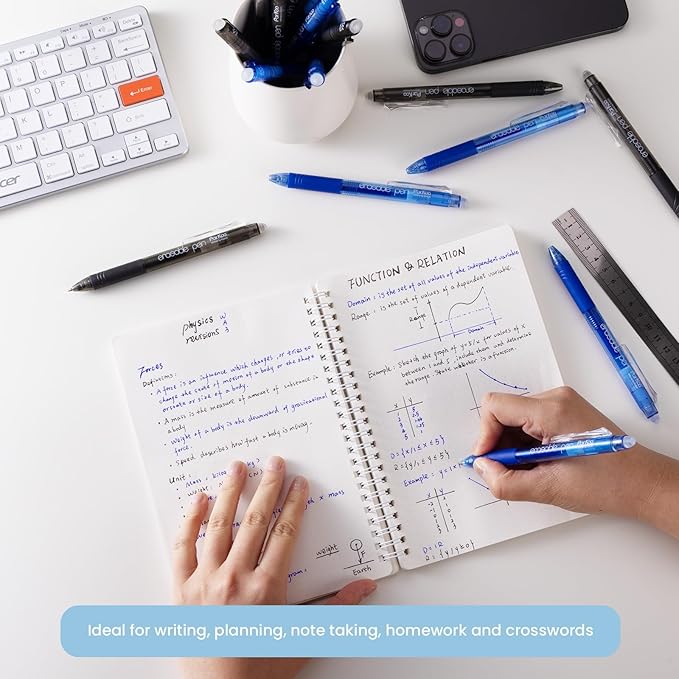 - Dual-Color Versatility: 10 black erasbale pens + 10 blue erasable pens, the smudge-resistant gel ink ensures crisp lines, while color-coding helps prioritize tasks in journals, calendars, or editable study guides