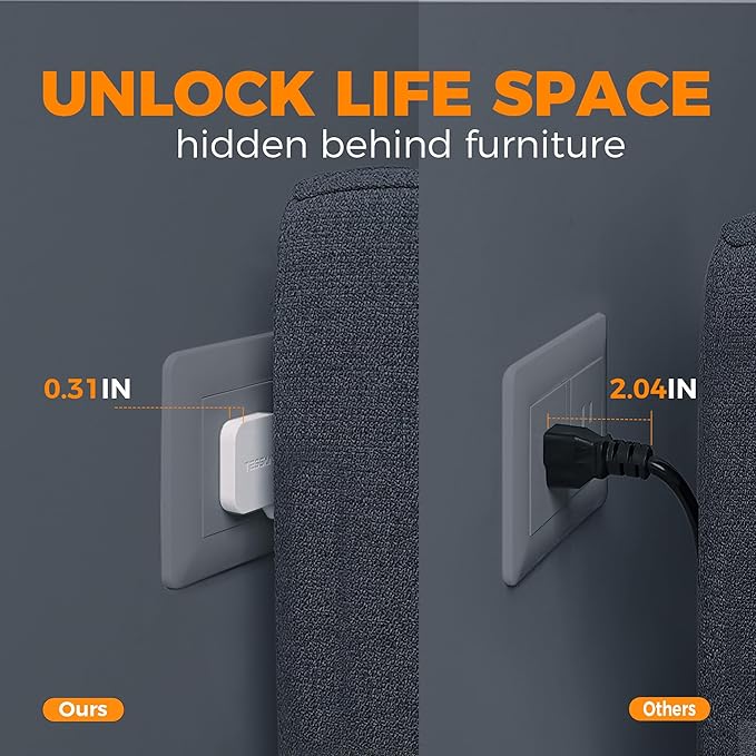- Ultra Thin Flat Plug: The 0.31 inches deep design fits easily into tight spots, like behind sofas, beds, and cabinets for saving space; The 45 degrees right angle plug of power strip won't block the bottom receptacle of your duplex outlet