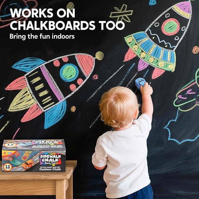 - Super Value Pack: Includes 24 pieces of race car shaped chalk in 12 vibrant colors, great for kids to enjoy art, drawing, and painting on sidewalks, chalkboards, or other creative surfaces. Motivate creativity in every masterpiece!