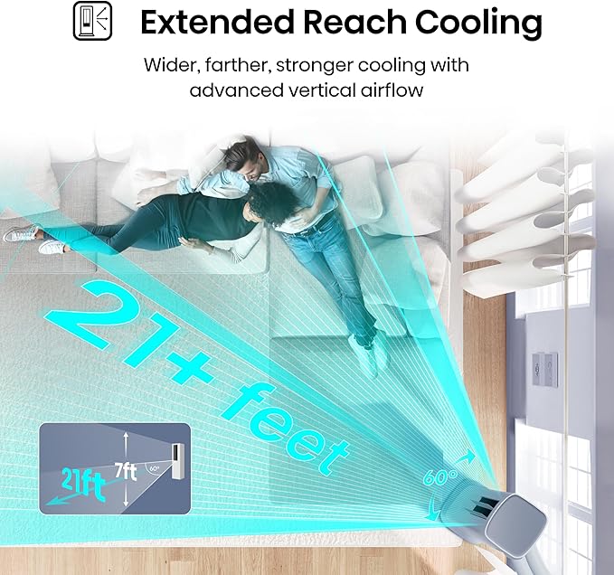 - Extended Reach Cooling – A high-performance vertical cross-flow fan propels cool air up to 21 feet with a 60-degree wide coverage, ensuring rapid and even cooling across larger spaces.