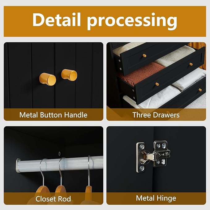 - 【Elegant Style】This wooden wardrobe is a simple but elegant design, it combines black panels with gold handles to create luxury charm.This large wardrobe matches well with various house decors.