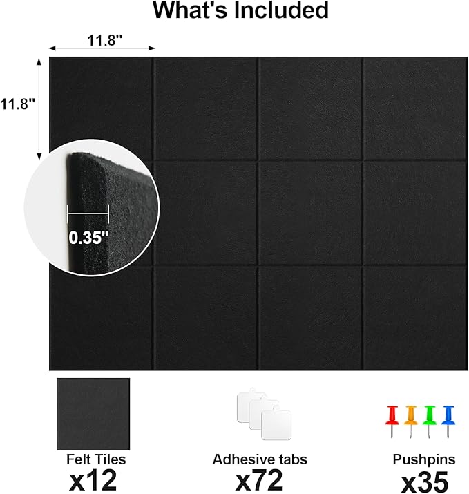 - LARGE CORK BOARD ALTERNATIVE: Each panel measures 11.8"x11.8"x 0.35", 12 felt panels, you can easily customize the size you need, with free combination splicing, and color splicing, such as 48"x36", 72"x48", 96"x48", etc.