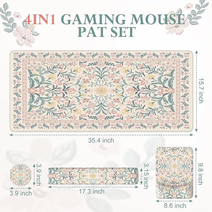- Mouse Pad Set Size: Computer mat for desk: 35.4 x 15.7 inch, wrist rest for computer keyboard: 17.3 x 3.2 x 0.8inch, wrist rest for mouse: 9.8 x 8.6 x 0.86inch, Coaster: 3.9inch. Please make sure you have enough office space, the extended desk mat accommodates a full-size keyboard and mouse