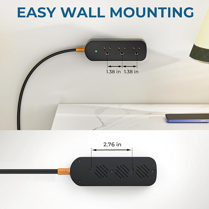 - Multi-Function Power Strips: 45-degree flat plug design saves space against the wall, and the cable swivels 360° for durability.2 keyholes on the back allow you to securely install this surge protector extension cord in various applications, such as workbenches, floor mounts, wall mounts, under counters, dorm room, garage, and more