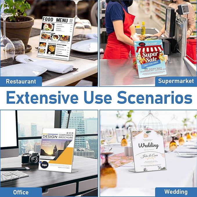 - 【Wide Application】This package contains 13 pcs 5X7 inch picture paper stand. Our L-shape vertical menu holder stand just insert the paper from the side to display your sign. They can display advertisements, menus, flyers brochures, etc., and can be used in homes, restaurants, offices, wedding scenes, trade exhibitions, and so on.