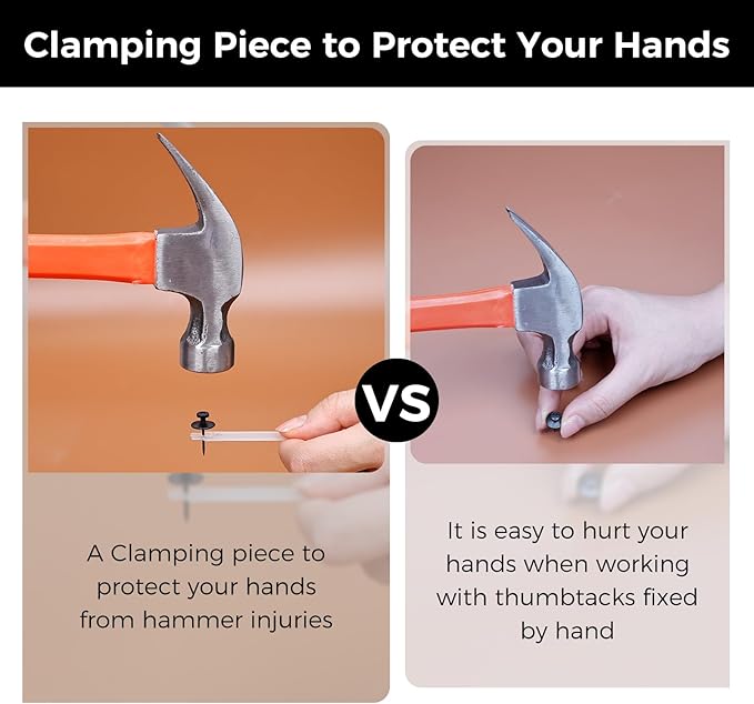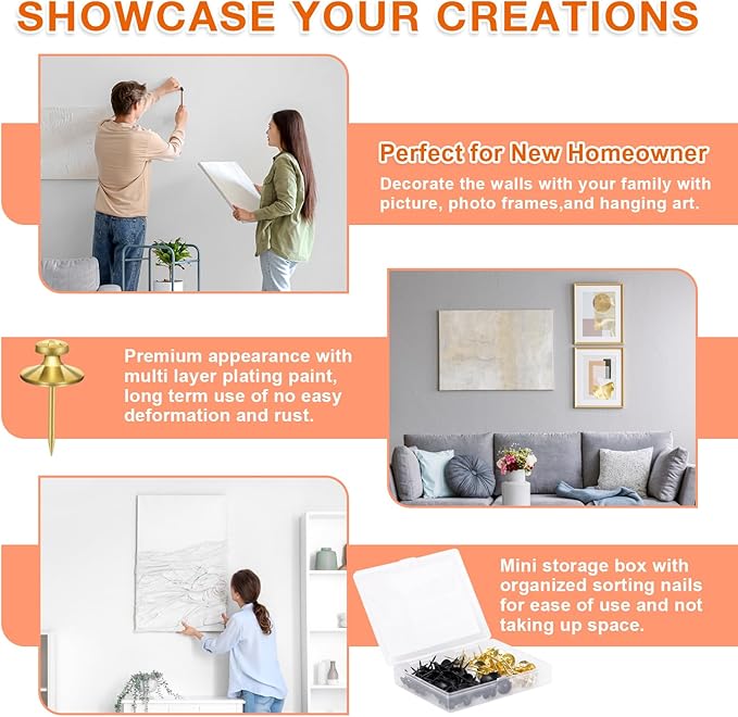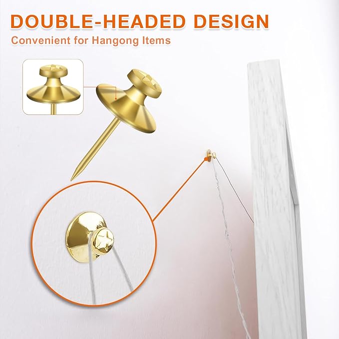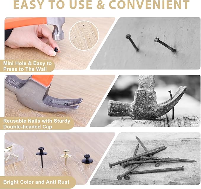 - THUMBTACKS FOR STABLE STRUCTURE: The picture hanging kit are designed with double heads, and the second head provides strong support for the nails for hanging pictures, making it easier to hang heavier objects on the wall without slipping or falling off. Each wall nails for hanging can safely support up to five pounds.
