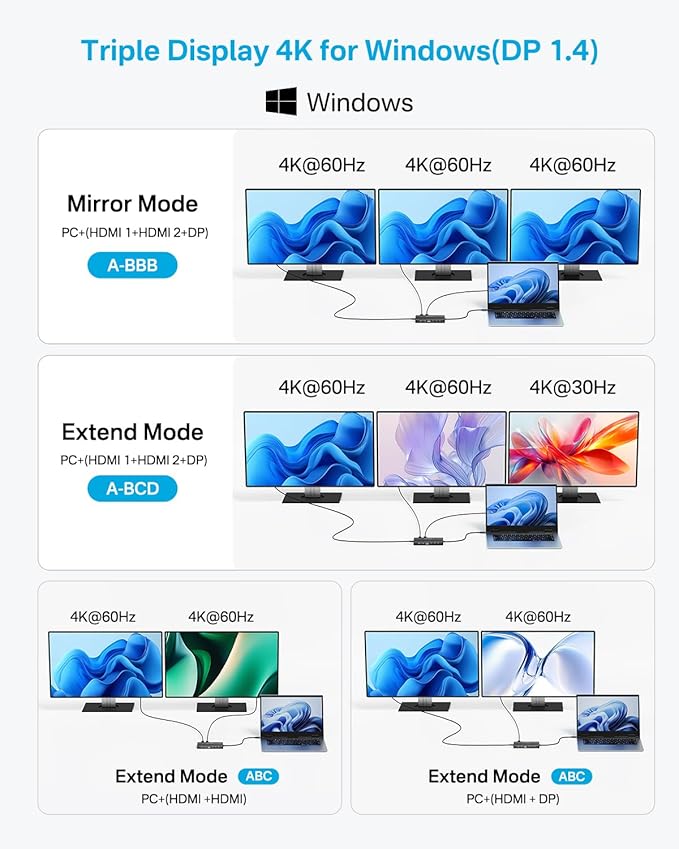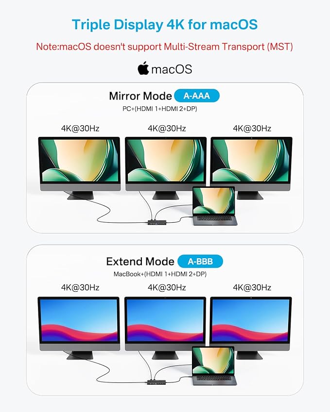 - Laptop Docking Station Triple Display: This usb c to DP/HDMI adapter supports single 4K@60Hz display and triple 4K@30Hz displays(under DP1.4). ONLY Windows system support MST and SST(Mirror & Extend Mode). MacOS system DOES NOT support MST