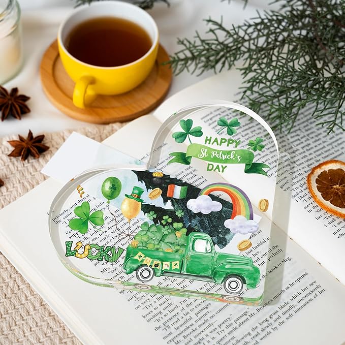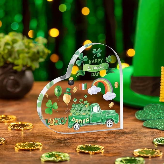 Yopyame Acrylic Gifts Irish Blessing - Happy St. Patricks Day Gift Four Leaf Clover Acrylic Heart Sign Desk Decor for Table Lucky Shamrocks Keepsake Paperweight for Women Home Office Desk Shelf Mantle