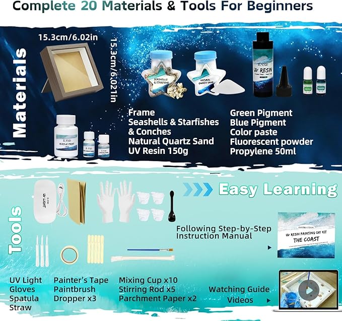 - 🛠️ All-Inclusive Craft Kits: With frame, UV resin kit with light, pigments, tools, sand, and seashells, follow our step-by-step guide to craft resin art like a pro— nice for beginners!