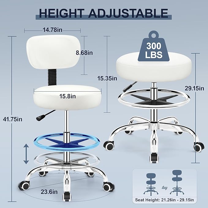 - Adjustable Height and Footrest Ring: The height of the rolling chair can be adjusted from 33.86 inches to 41.75 inches, making it suitable for users of varying heights. The footrest ring of the standing desk chair can be adjusted up and down by 7.87 inches, allowing you to find a comfortable angle for your legs