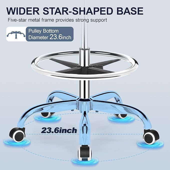 - Humanization Design: 15.8-inch cushion, more suitable for the comfortable size of most people; 23.6-inch five-star casters drafting chair, less prone to tipping over and more stable. The 2mm thick base supports up to 300 pounds