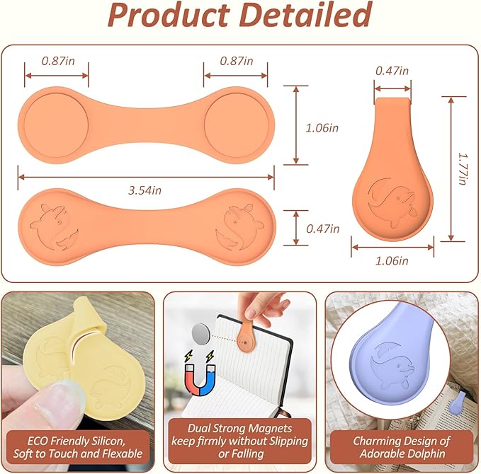 - 📚【Enjoy Reading Time】This magnetic bookmark can help to record reading process and mark favorite chapters when reading book. Bring you better reading experience. These 3 silicone bookmarks are in different colors(pink, blue cyan-blue) with cute dolphi sign, it is also a exquisite charms for your books enhancing your reading interests.
