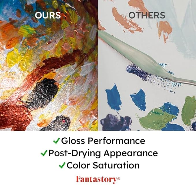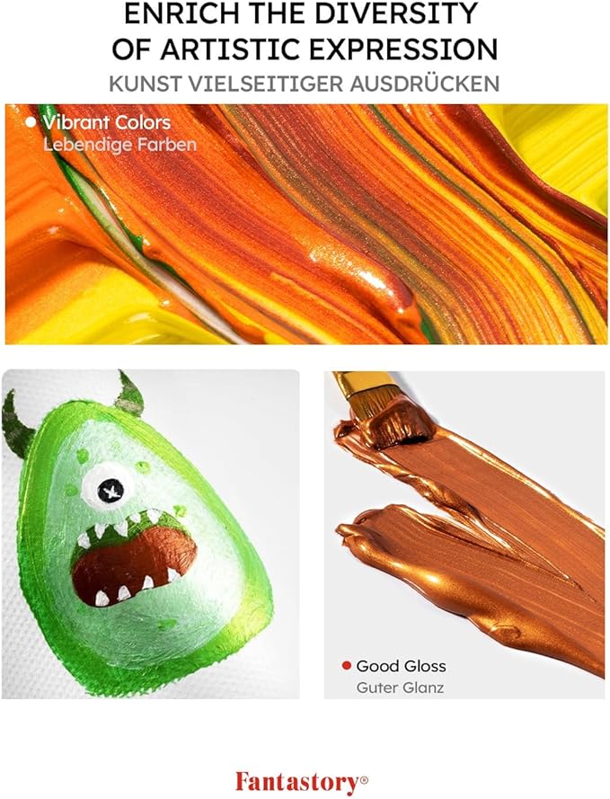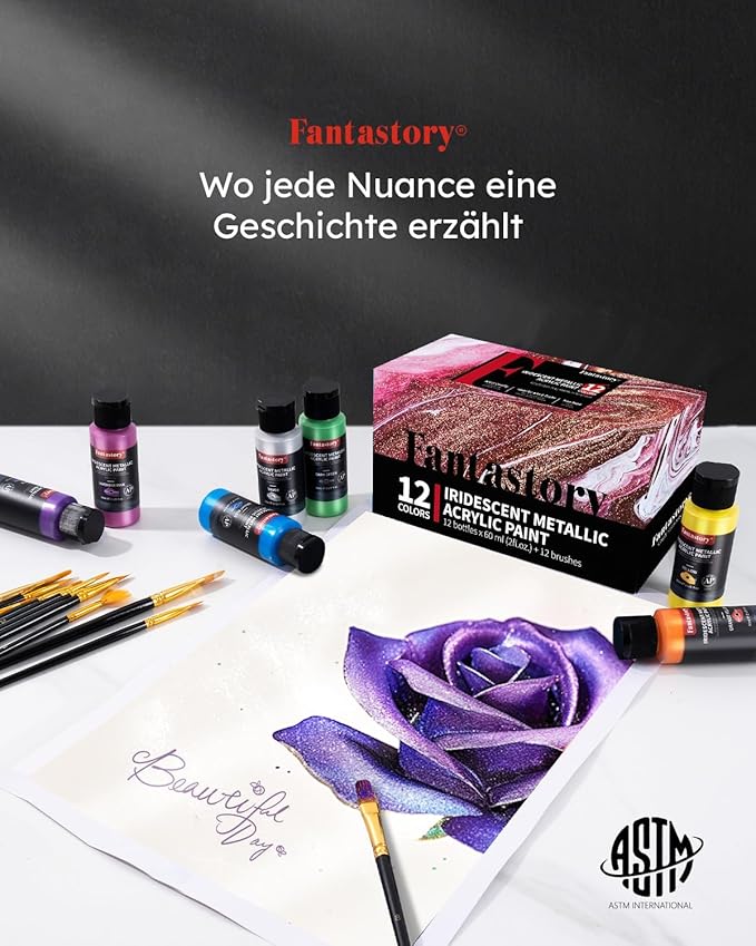- SHIMMERING HIGH-PIGMENT METALLIC COLORS: Fantastory 12-Color acrylic paint set features unique shimmering metallic hues with an exceptionally high pigment concentration and outstanding pigment deposition, offering exceptional coverage and unmatched color brilliance. Perfect for professional artists, painters, art instructors, dedicated hobbyists, and motivated beginners.