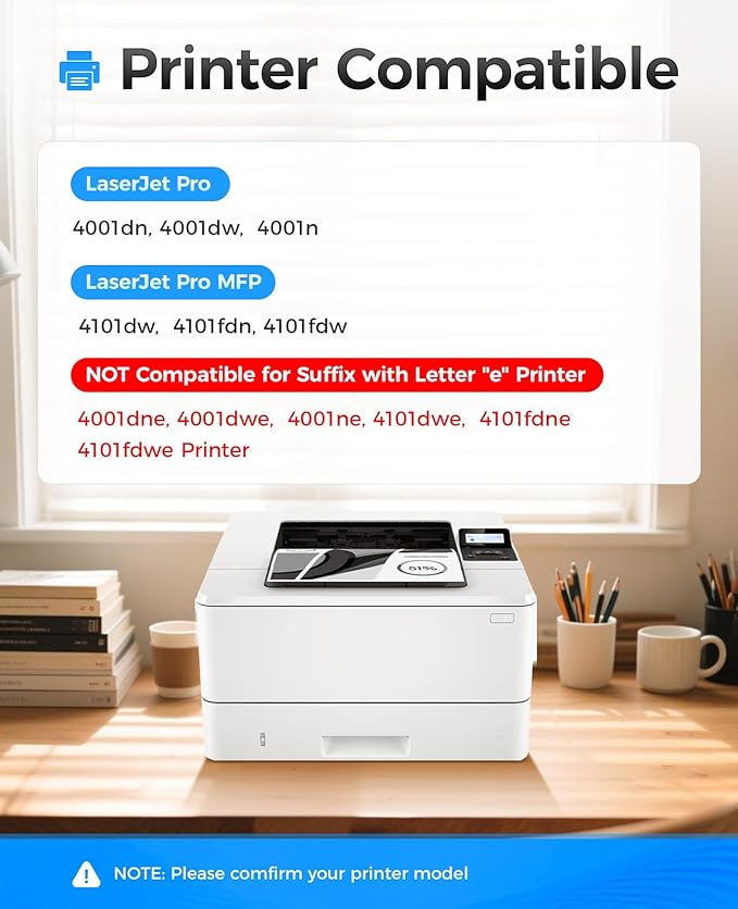 - Compatible Printer: Compatible with HP LaserJet Pro MFP 4101fdw 4101fdn 4001dw 4001dn 4001n printer. NOT Compatible for Suffix with Letter "e" such as: Pro MFP 4101fdwe/ Pro 4001dwe Series Printer.