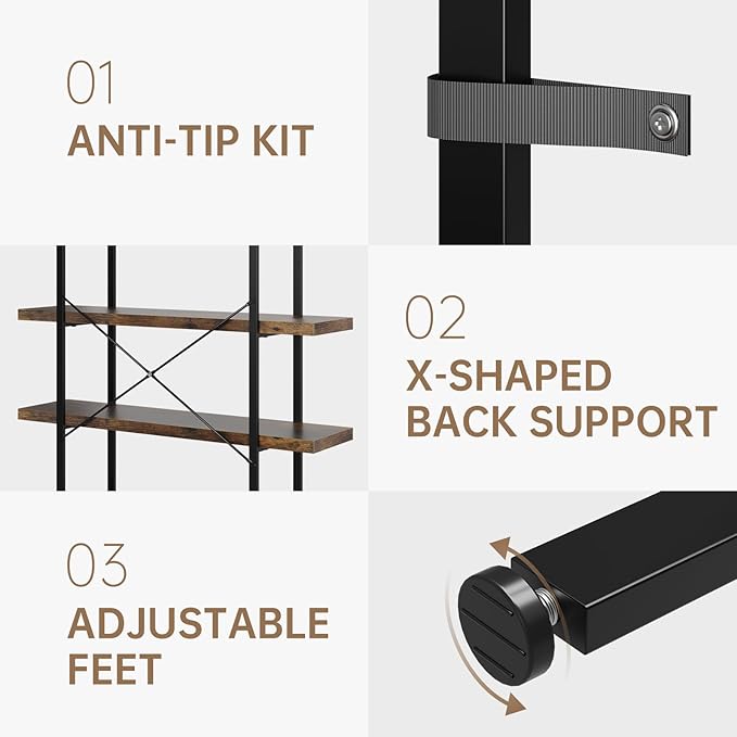 - Stable and Durable Construction: Capable of holding heavy items securely, this bookcase features a matte black steel frame with X-shaped support, adjustable feet, and two anti-tip devices, ensuring enhanced stability and durability for your belongings