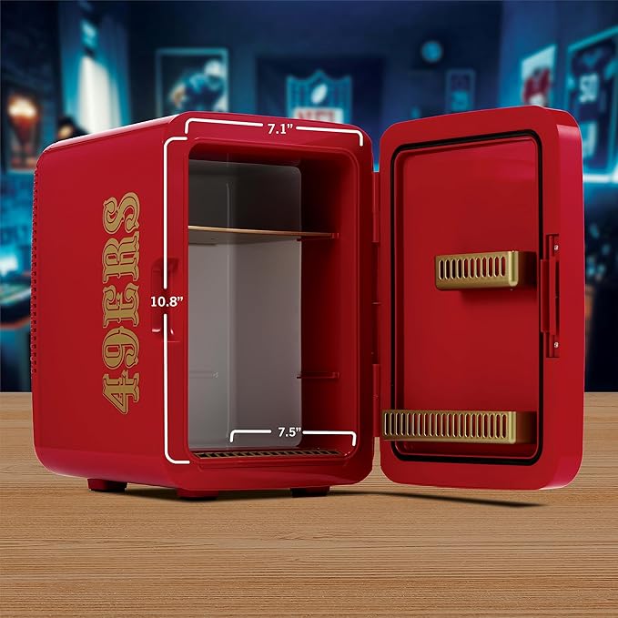 - Officially licensed Team Swag: Mini fridge features the 49ers logo and team colors (+ the NFL logo). Big Game: 10L capacity—holds up to 15 12 oz. soda cans or a whole bunch of snacks