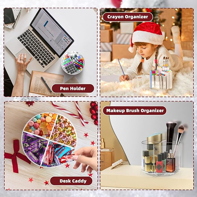 - 360 Degree Rotating Desktop Organizer -This organizer with 360 degree rotating designed, can not only organize pens and pencils, but also makeup brushes and lipsticks.This acrylic desk organizer making your tabletop look more advanced. Our pen organizers can be spins both sides, which is very convenient for storing pens and craft supplies, and it is easy to find and take the items we need by gently rotating it.