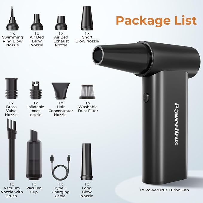 - 【What You Get】: 1 x PowerUrus Turbo Fan; 1 x Long Blow Nozzle; 1 x Swimming Ring Blow Nozzle; 1 x Air Bed Blow Nozzle; 1 x Air Bed Exhaust Nozzle; 1 x Short Blow Nozzle; 1 x Type C Charging Cable; 1 x Vacuum Cup; 1 x Vacuum Nozzle with Brush; 1 x Washable Dust Filter; 1 x Hair Concentrator Nozzle; 1 x Brass Valve Nozzle; 1 x Inflatable Boat Nozzle; 1 x User Manual