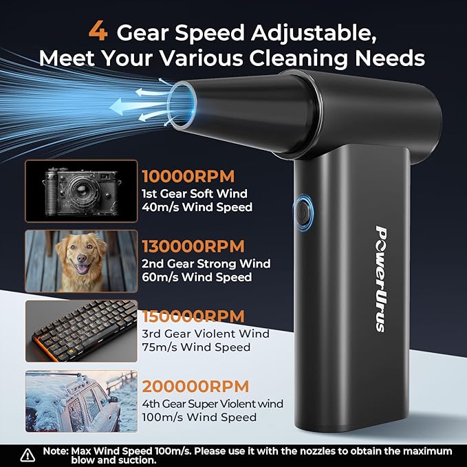 - 【Powerful Compressed Air Duster】: PowerUrus compressed air duster is powered by a high-efficiency brushless motor and boasts a maximum speed of 200,000 RPM, delivering air pressure up to 260G and wind speeds exceeding 100 m/s. The ultra-high-speed motor ensures exceptional performance and powerful airflow, allowing you to clean with maximum efficiency. The wind force generated is twice that of a traditional cleaner air duster. It can easily meet all the cleaning needs in your daily life.