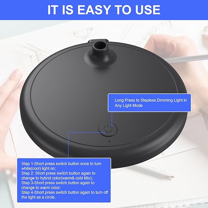 - 【Adjustable Brightness and Color Temperature】 This dimmable desk light offers 3 brightness levels and 3 color temperatures (4200K-4600K). You can easily choose a variety of lights for painting, reading, writing, kindle reading lighting needs. easily adjust the brightness by touch. Cool white lighting great suit for working, studying, reading.