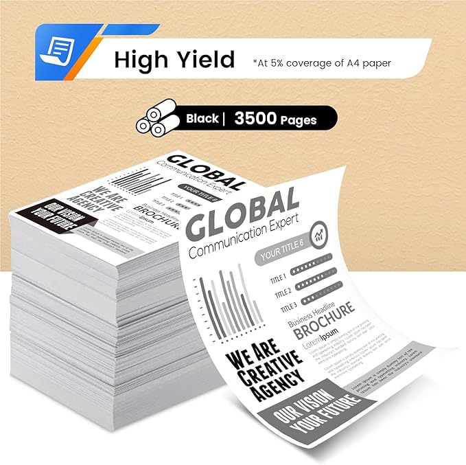 - Page Yield: Up to 3500 pages per black toner cartridge at 5% coverage.